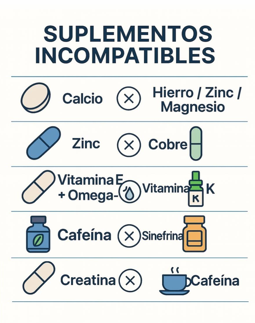 Algunas combinaciones de suplementos compiten entre sí, reducen su absorción o potencian efectos no deseados. A continuación se muestran las más relevantes y qué hacer en cada caso.