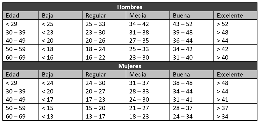 - En adultos jóvenes saludables, valores superiores a 50 ml/kg/min en hombres y más de 40 ml/kg/min en mujeres se consideran elevados.
